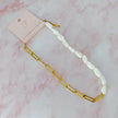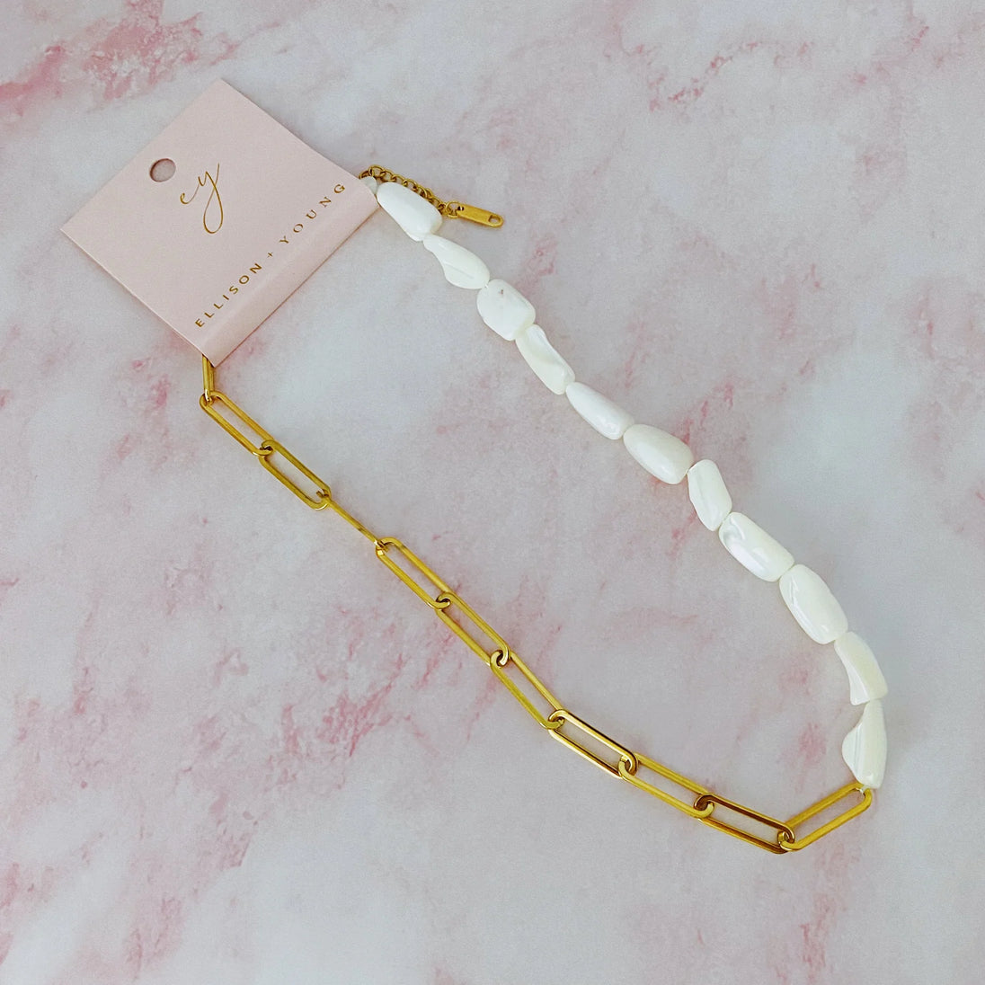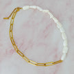 This Chain and Shell Pearl Necklace is a sophisticated statement piece crafted from 18k gold plated stainless steel chain and shell beads. Its half chain and half shell design offers multiple ways to achieve different looks.