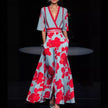 This elegant women's dress features a vibrant printed pattern on soft polyester fabric, designed with a flattering A-line silhouette and a mid-rise waist. Its V-neck collar and short sleeves add a refined touch, while the pleated belt enhances your shape.
