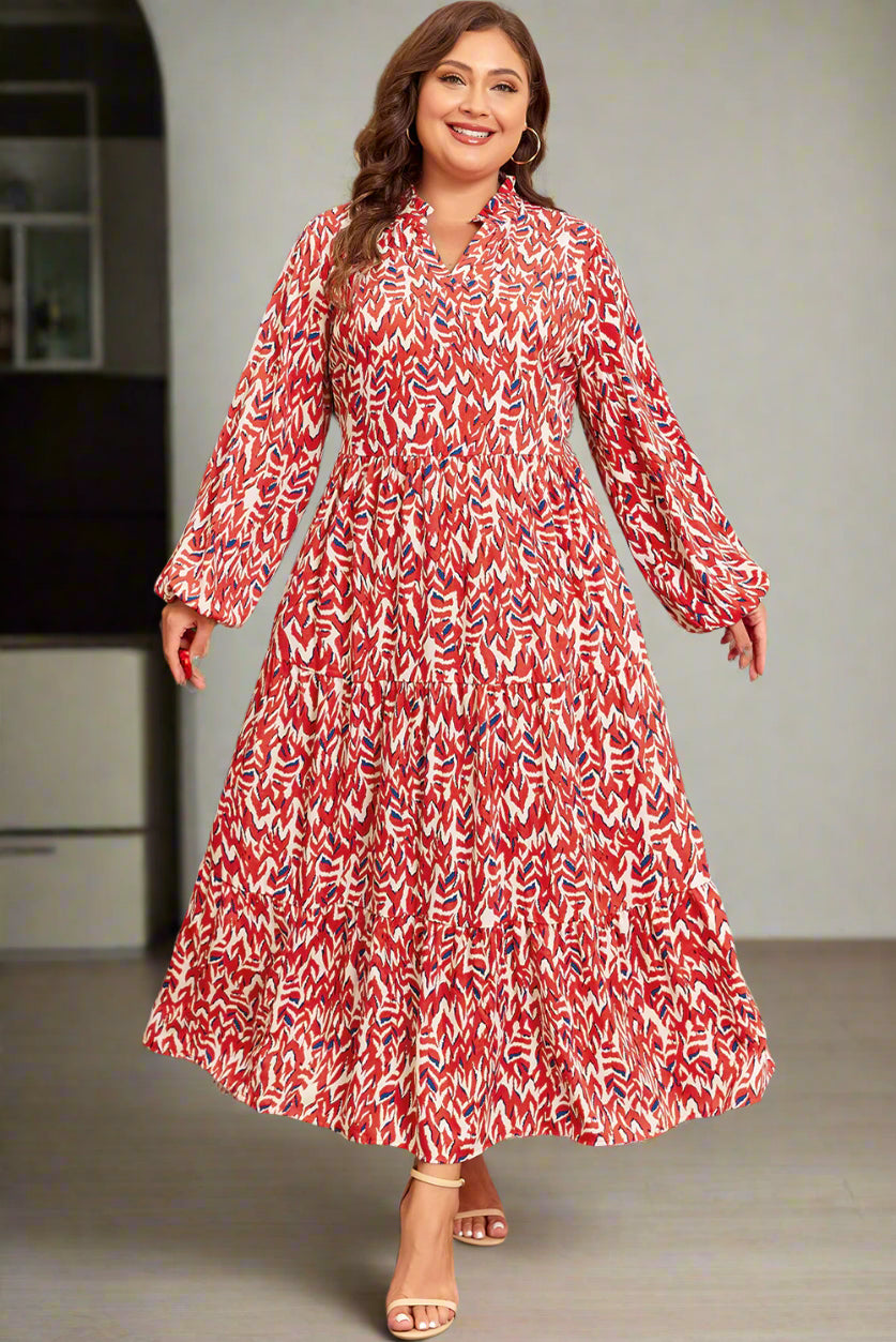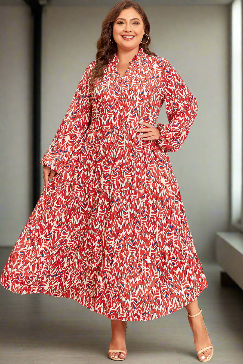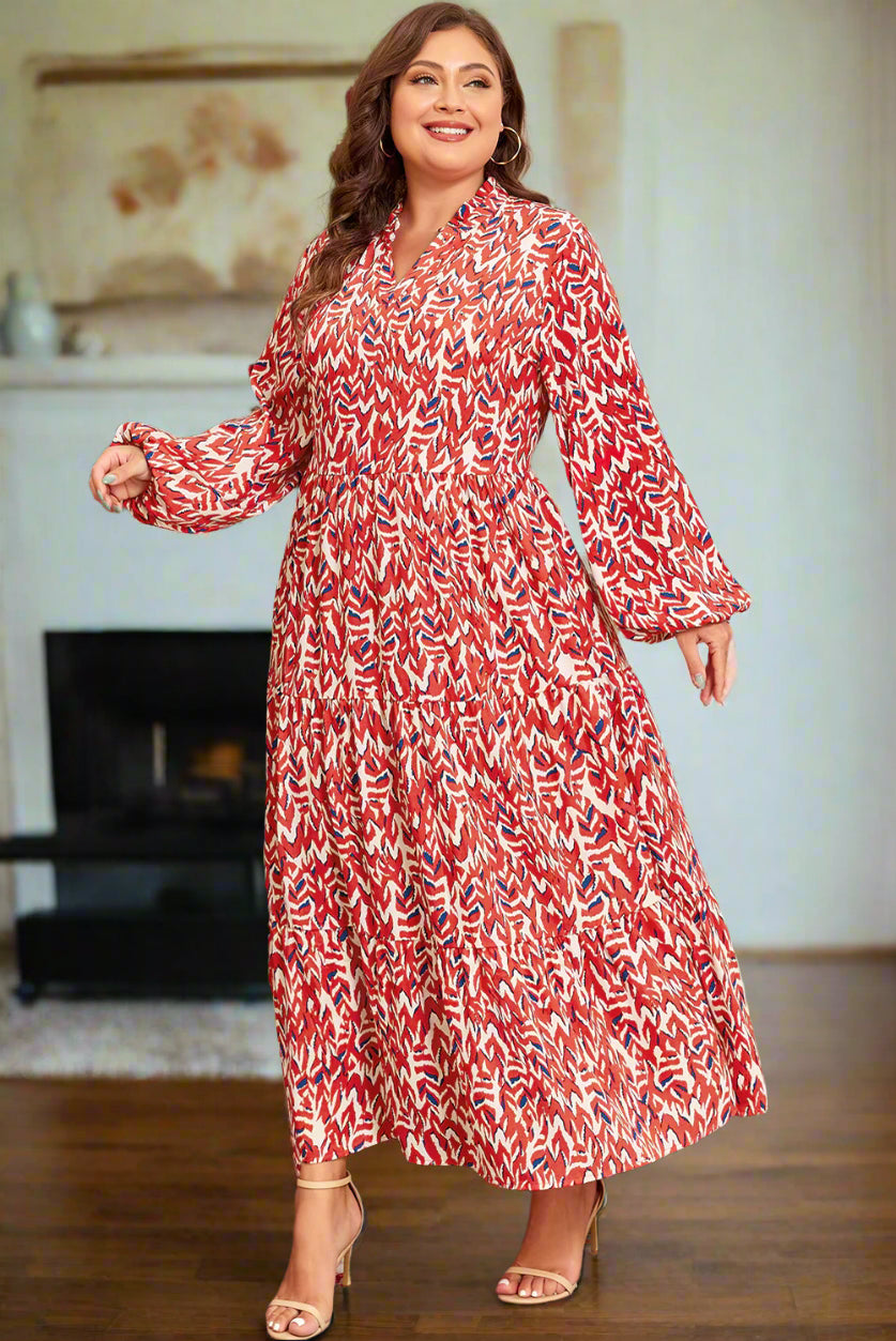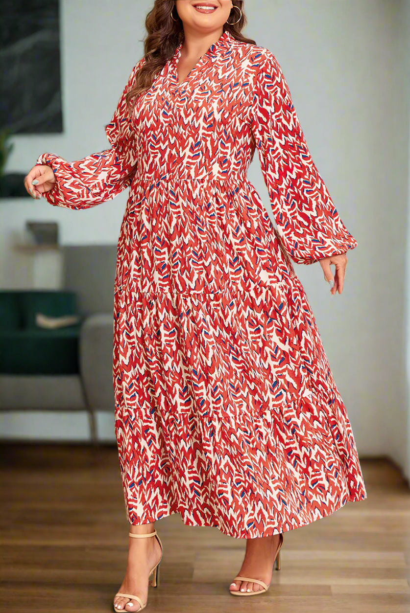 Women's Red Plus Size Abstract Print Notch V Neck High Waist Maxi Dress