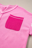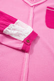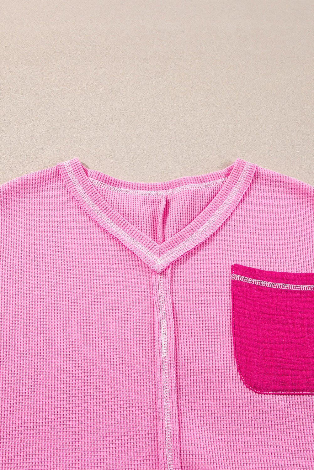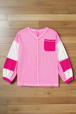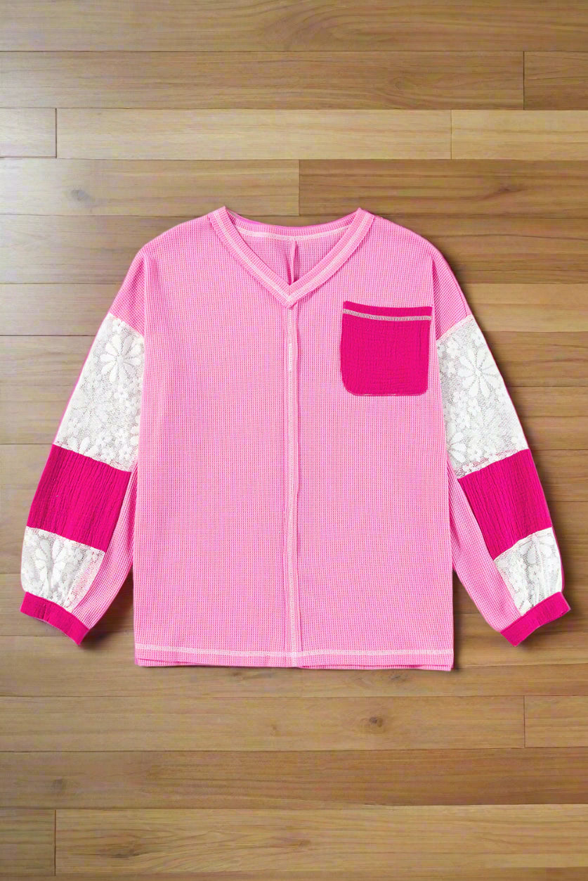 Women's Bonbon Lace Floral Patchwork Sleeve Stitching V Neck Rib Knit Blouse