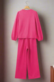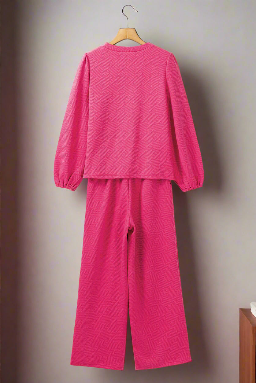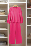Women's Rose Red Textured Puff Sleeve Top and Pants Set