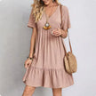 Step into effortless elegance with our Solid Color V-Neck Midi Dress, designed for a flattering, relaxed fit. Featuring a classic V-shaped collar and a loose-fitting waist, this dress offers all-day comfort while maintaining chic sophistication. The mid-length cake skirt adds a touch of playful volume, creating a flowing, breezy silhouette perfect for any casual outing.