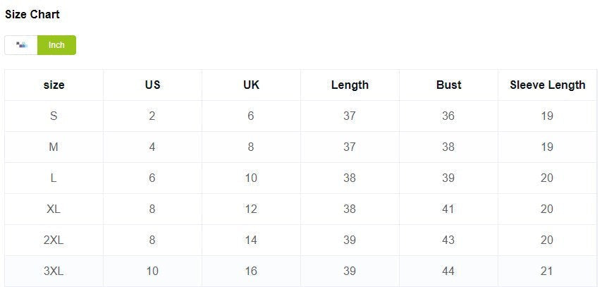 | Size | US | UK | Length | Bust | Sleeve Length |