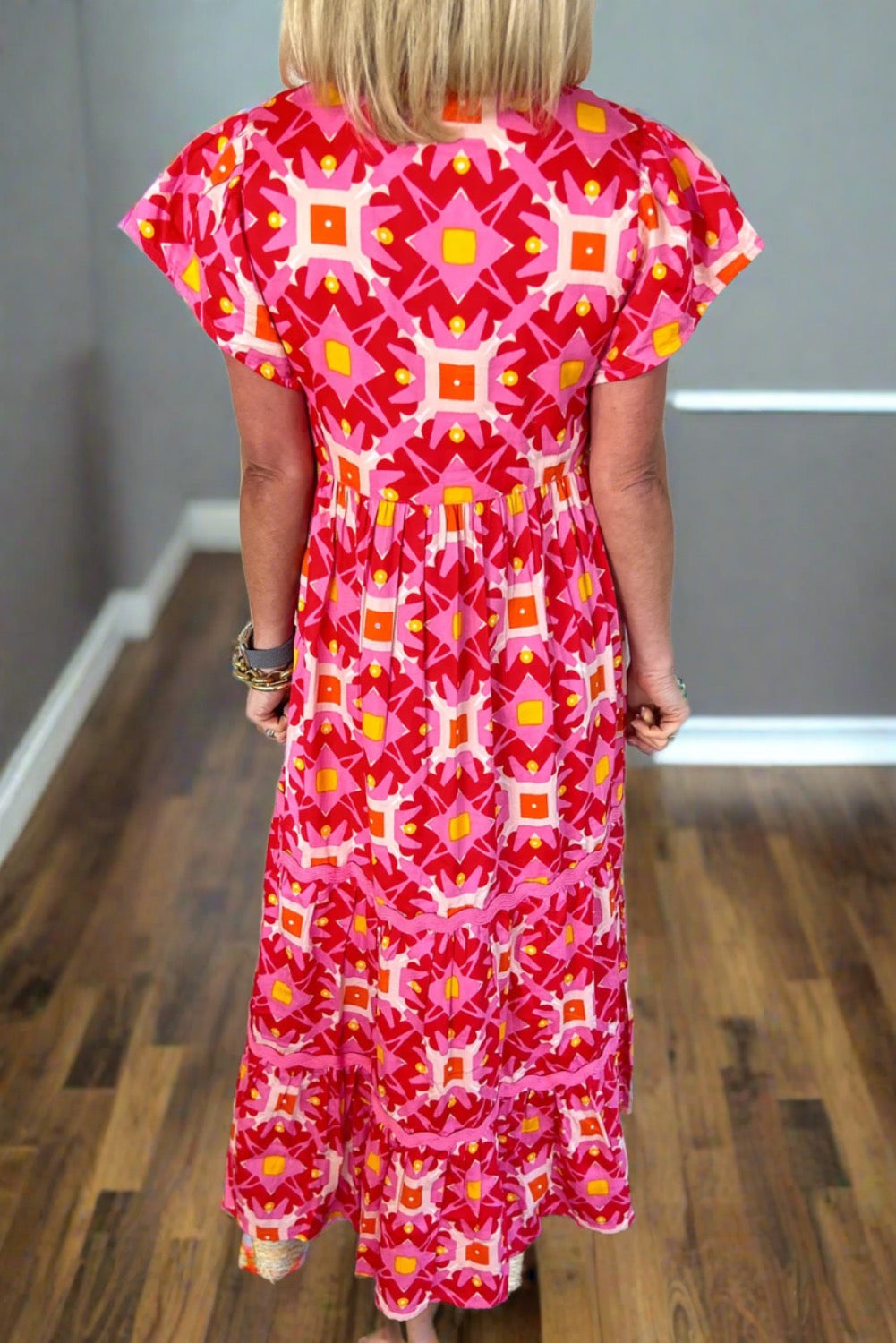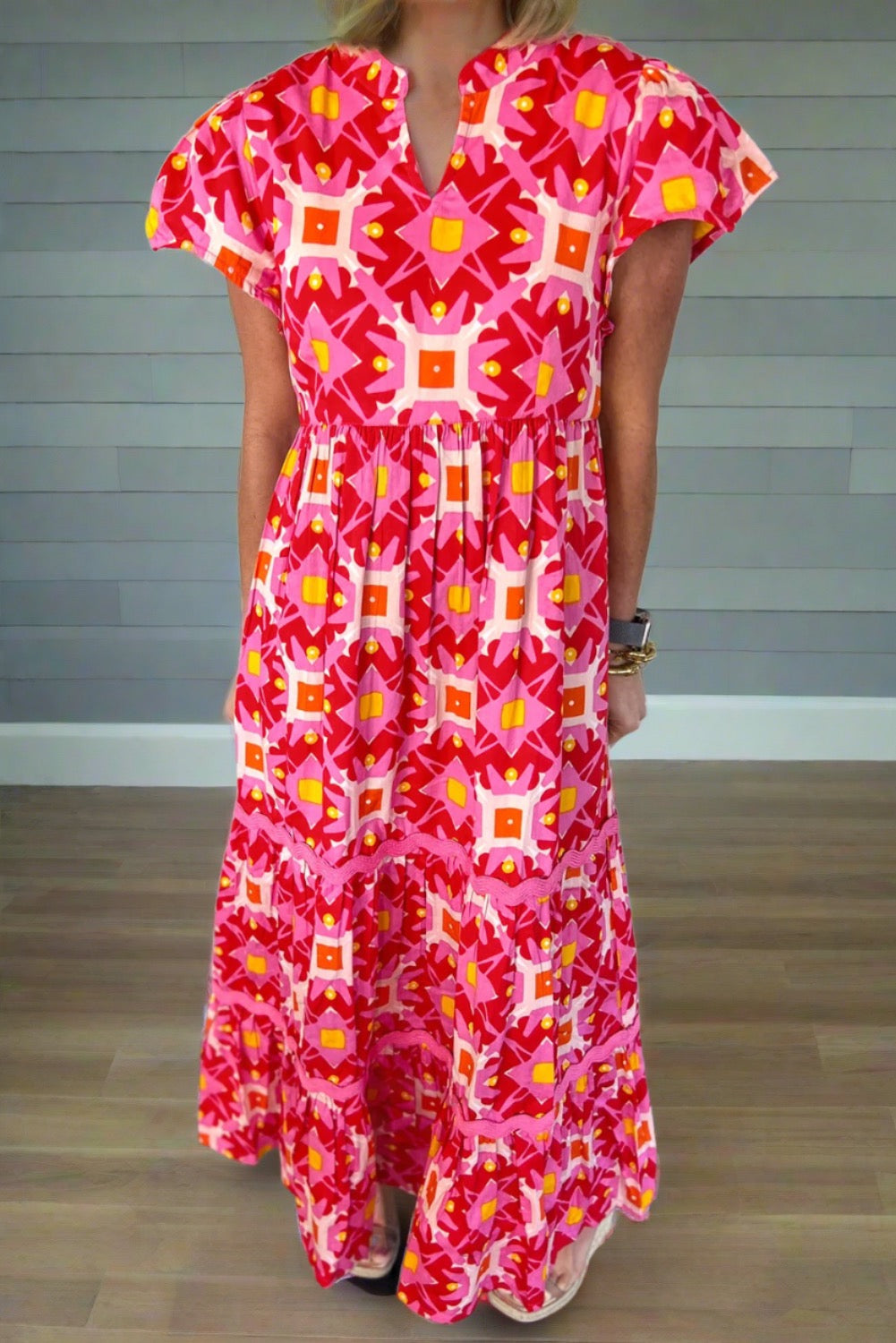 Women's Strawberry Pink Abstract Print Pleated Flounce Sleeve Maxi Dress