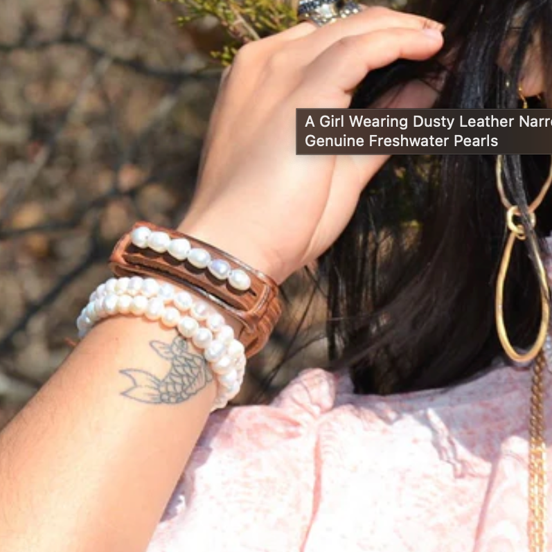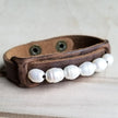 A genuine strand of freshwater pearls is sewn onto a genuine leather cuff with two adjustable snaps.